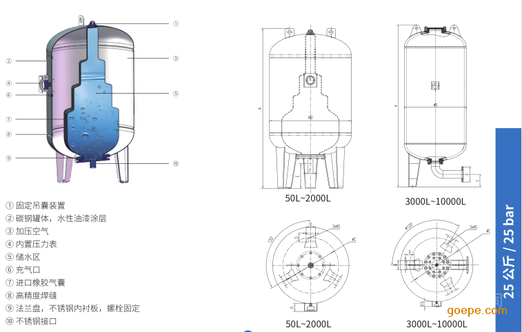 SuperFlow pressure tanks are ideal for applications with high pressure levels, including high-rise buildings (residential or office buildings, etc.) and multi-storey buildings (hotels, hospitals or schools, etc.). Available in volumes ranging from 50L to 10000L, it is one of the most comprehensive products in the world. The SuperFlow series features a replaceable bladder design that allows you to replace the internal rubber bladder at any time; all products above 100L have a built-in pressure gauge that allows easy control of system pressure, and you only need to check the priming pressure every 6 months.
